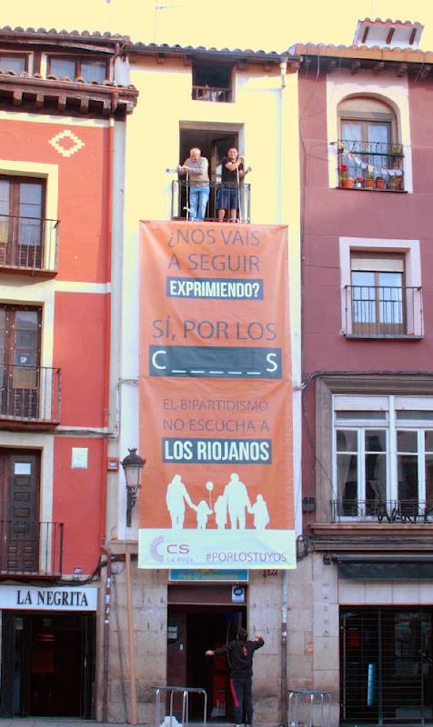 Estaba anunciado que esta tarde, el colectivo LGTBI de La Rioja y sus diversas asociaaciones iban a celebrar el Día de la Visibilidad Trans en el bar El Submarino, de la plaza del Mercado de Logroño. Estaba anunciado pero no será así. Porque en ese ínterin de tiempo la fachada del mismo edificio ha sido adornada con una enorme lona que publicita la campaña electoral de Ciudadanos, que lleva como lema el típico ‘no riojano’. Es decir, el ‘sí, por los cojones’.