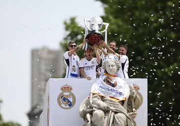 Hasta la fuente de la diosa llegó el autobús descapotable de los campeones de liga por trigesimosexta vez en su historia tras aguantar bendiciones y escuchar los discursos de la madridista Isabel Díaz Ayuso, presidenta de la Comunidad, y José Luis Martínez Almeida, alcalde de conocido sentimiento rojiblanco. Allí, en un vehículo con el campeones en letras moradas y amarillas, engalanado con el 36 y en una pasarela blanca inmaculada de quince peldaños, empezaron la fiesta, dj y confeti incluido, aunque la auténtica verbena la esperan los blancos para el próximo 2 de junio sin son capaces de alzar por decimoquinta vez la Liga de Campeones en la final que disputan un día antes en Wembley ante el Borussia Dortmund.