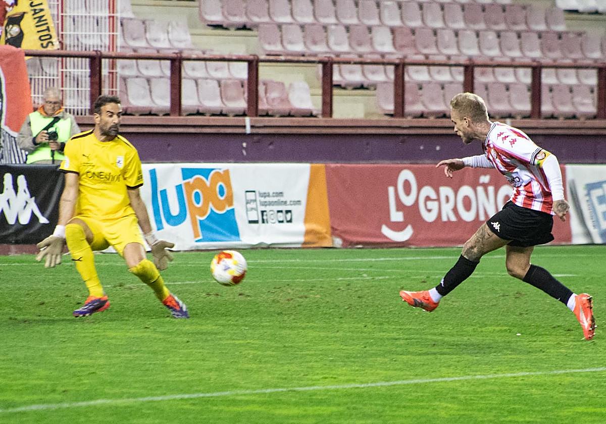 Acababa de cumplirse el minuto 45 del partido entre la Sociedad Deportiva Logroñés y el Náxara. El cuarto árbitro ya había mostrado el añadido, un minuto más, y David Sánchez se hizo con el balón en la zona de tres cuartos. El centrocampista vio el desmarque de Sergio Gil, filtró un buen pase y el mediapunta blanquirrojo definió ante Toño Ramírez. Así se desequilibró un encuentro que hasta entonces marchaba sin goles por dos razones: la falta de acierto de los logroñeses en los metros finales y que el Náxara no había marcado en su única llegada, eso sí, clarísima.