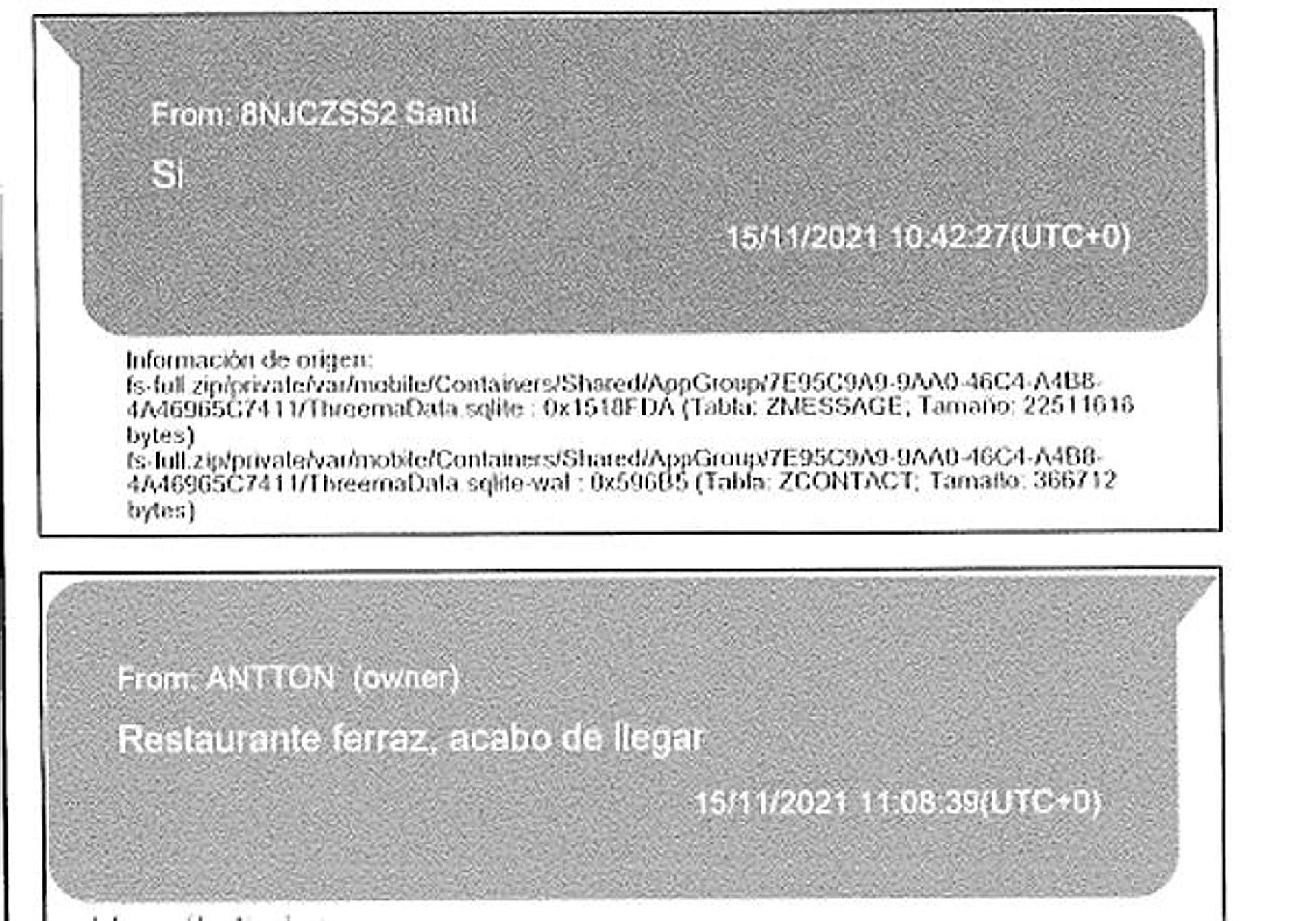 La UCO también señala que entre Antxón y Santos se comunicaban para sus encuentros a través de la aplicación Threema, un programa similar al Whatsapp pero que eleva mucho más la privacidad, seguridad y anonimato de los mensajes. Esta aplicación utiliza el cifrado de extremo a extremo para proteger todos los mensajes y llamadas. De esta forma concertaron entre ambos una comida en 2021 frente a la sede del PSOE en Ferraz.