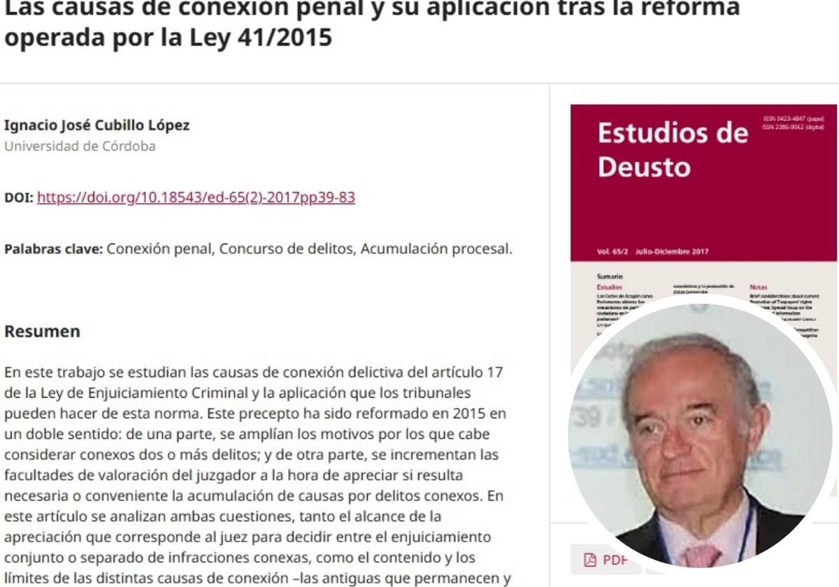El artículo se llama «Las causas de conexión penal y su aplicación tras la reforma operada por la Ley 41/2015», lo escribió Ignacio José … Cubillo López, profesor de titular de Derecho Procesal de la Universidad de Córdoba, y fue publicado en 2017 por la «Revista de Derecho Público» de la Universidad de Deusto.