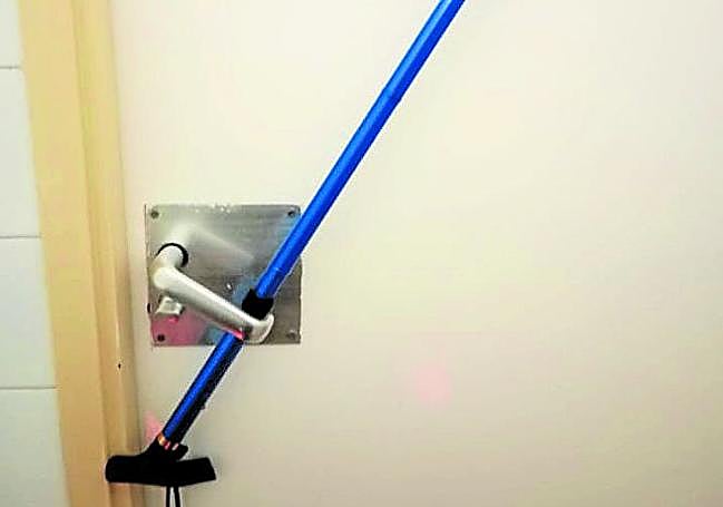 El remitente de esta fotografía apunta que el miércoles tuvo que apañárselas «atravesando el bastón» para poder cerrar la puerta del baño habilitado para minusválidos del Ayuntamiento de Logroño. «La puerta se abría y no había cerrojo. ¿No hay (dinero) para pestillos?», se pregunta. Con ellos podremos orinar tanto los discapacitados como los que entran a este baño porque es más grande».