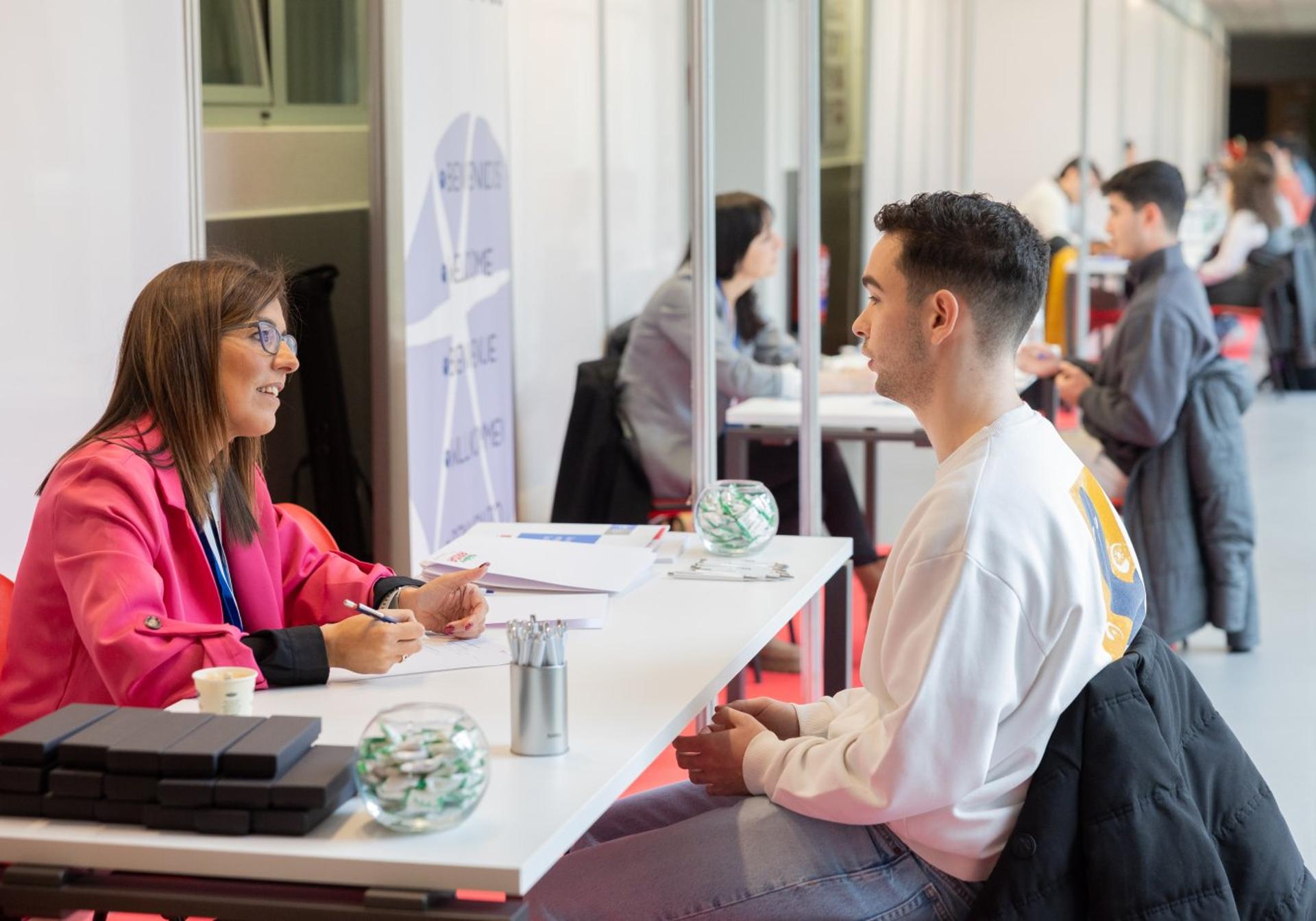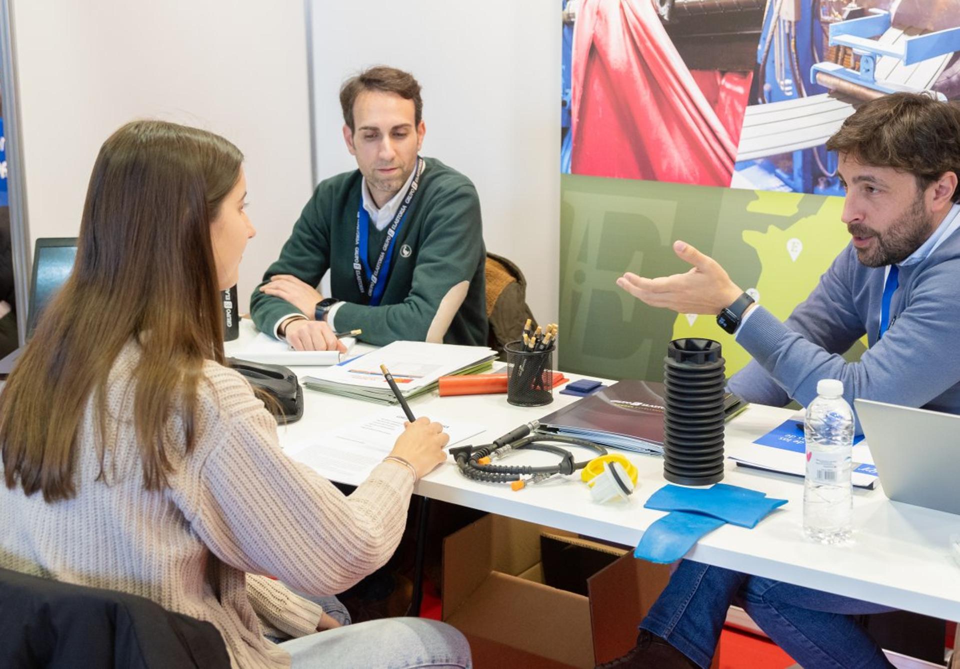 Mercedes Jiménez es una joven de 19 años, tímida pero con inquietudes profesionales. «Me ha llamado la atención toda la información que he recibido del Grupo Elastorsa, puede ser interesante», confesaba en presencia de Acacio Eguizábal, del departamento de Recursos Humanos de la firma arnedana que trabaja para sectores muy diversos como el agroalimentario, automoción y transporte, industria, moda, obra civil o infraestructuras, con el caucho como elemento principal –este miércoles en su stand tenían algún producto–.