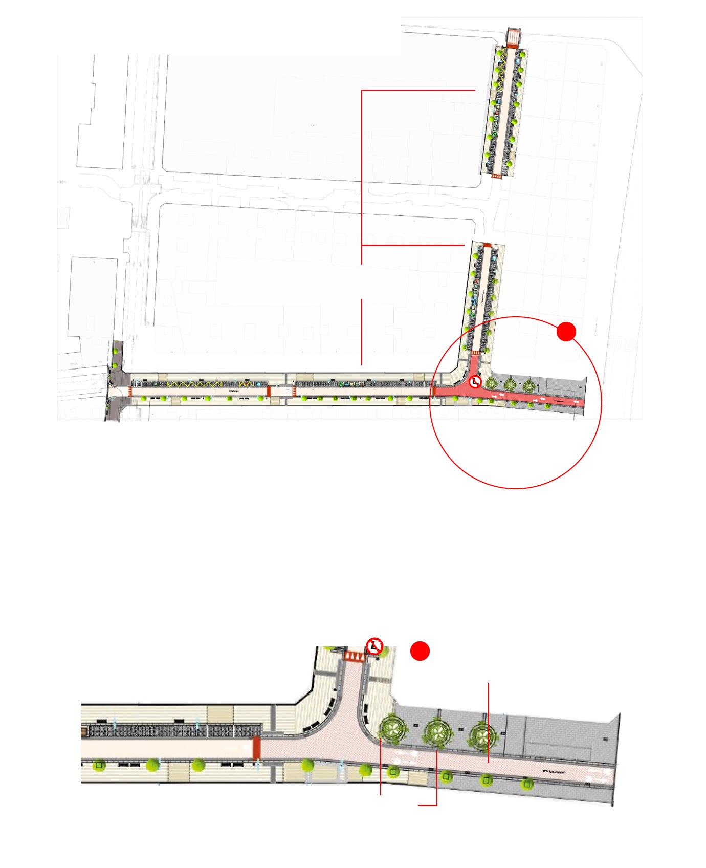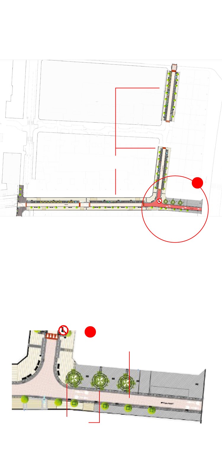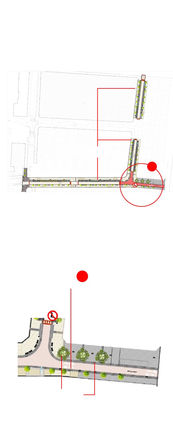 Así, el tramo que une la Gran Vía con la calle Vitoria discurrirá en plataforma única, con acceso de vehículos limitado a la circulación de bicicletas en los dos sentidos y con la circulación de vehículos motorizados restringida únicamente para el acceso a garajes en sentido norte-sur, así como a los vehículos de servicios. En este tramo habrá aparcamiento sólo en uno de los dos lados, lo que permitirá ensanchar la acera. El pavimento para las aceras será el existente en Gran Vía y para la calzada se ha previsto asfalto fundido impreso de color granate.